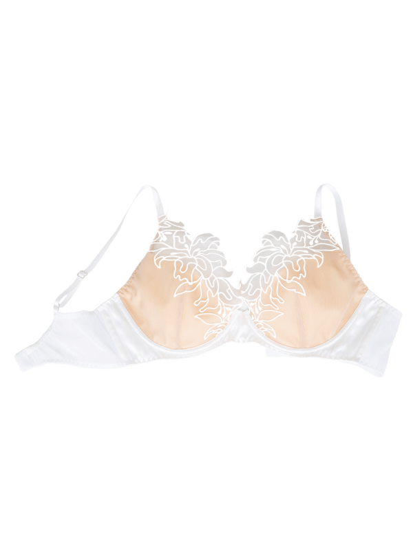 - シルエット:ナチュラルにバストを包み、重すぎず適度なサポート力。ワイヤー入り、パッド無し。 美しくて丈夫なレースと、伸縮性のあるパワーメッシュのカップが、豊かな胸を心地よくホールド。浅い前中心でワイヤーの当たりが気にならない。深めのカップでトップが出ない安心感あり。後アンダーは2重のメッシュでズレにくく、すっきりと細め。